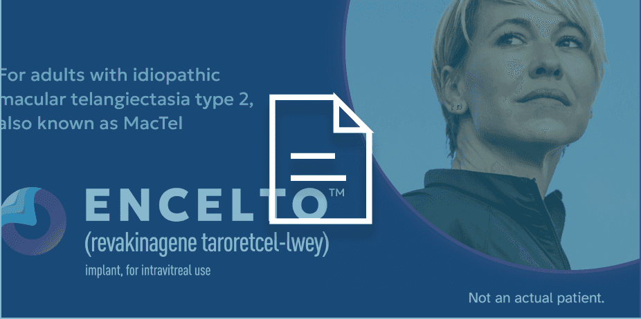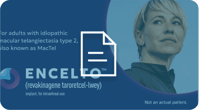 ENCELTO is used to treat adults with idiopathic macular telangiectasia type 2 (MacTel); a retinal disease that causes progressive vision loss. Your eye surgeon will assess your vision and review your medical history to determine if ENCELTO is the right treatment for you.